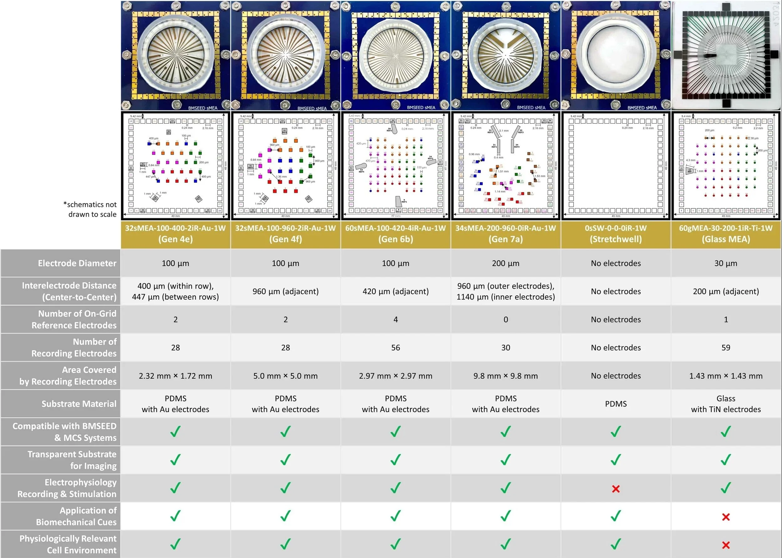 The sMEA generation can be chosen based on the number of recording/stimulating electrodes, interelectrode distance, and electrode recording area. Consult with BMSEED to discuss other customizable features, such as 3D microchannels, 3D pockets for organoids, and more.